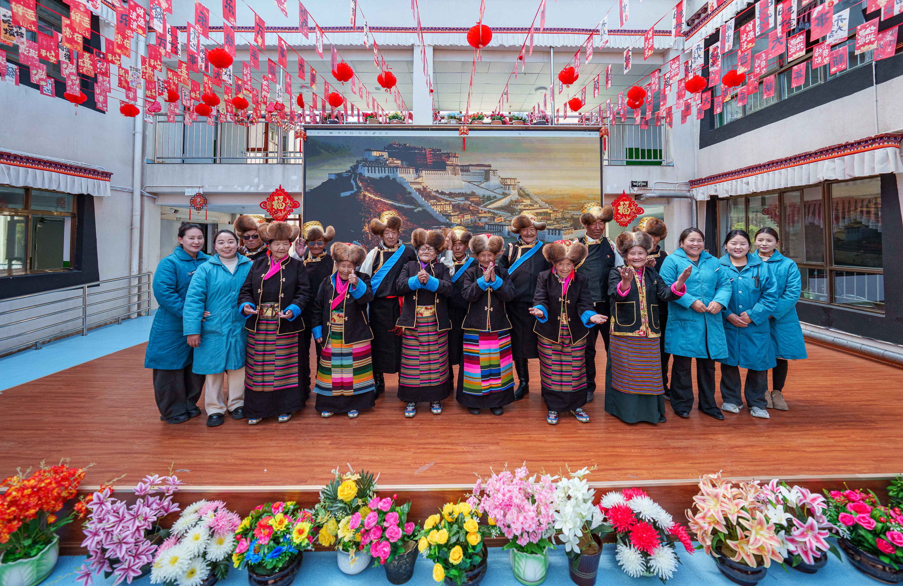 次德吉(前排右七)和部分山南市桑日县特困人员集中供养中心老人合影(3月25日摄)。
