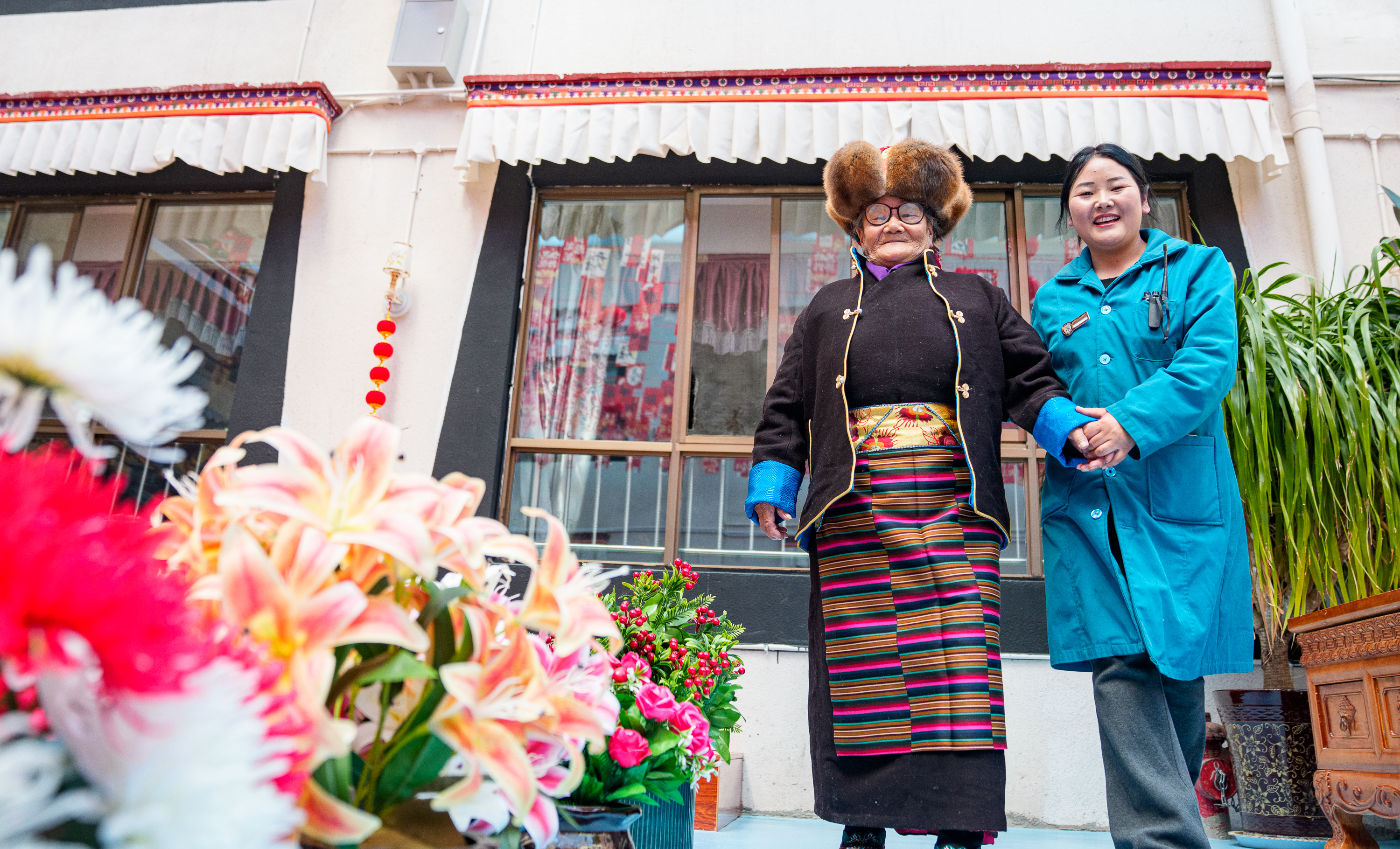 次德吉(左)和山南市桑日县特困人员集中供养中心工作人员一起准备去跳锅庄(3月25日摄)。