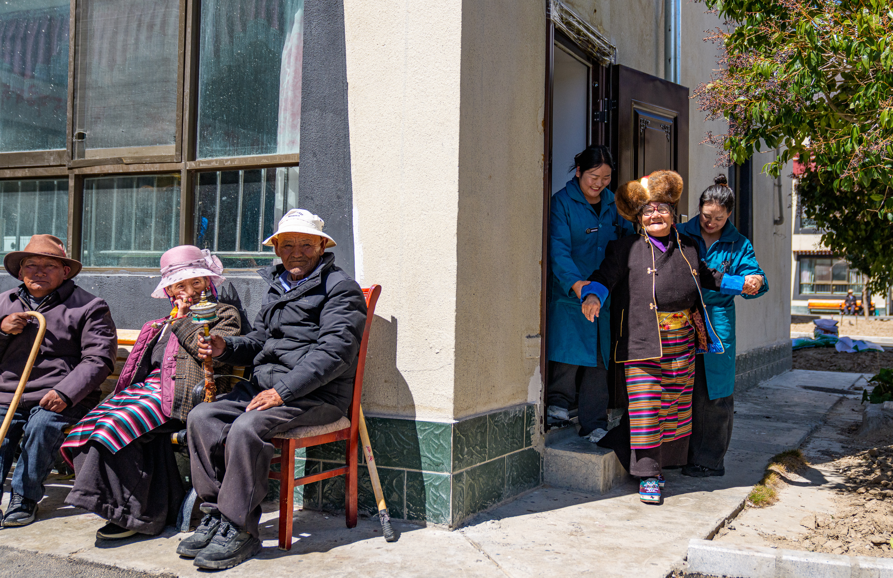 次德吉(右二)和山南市桑日县特困人员集中供养中心工作人员一起去晒太阳(3月25日摄)。