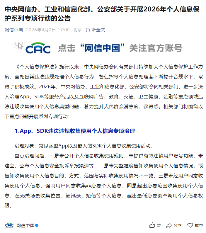 中央网信办、工业和信息化部、公安部关于开展2026年个人信息保护系列专项行动的公告