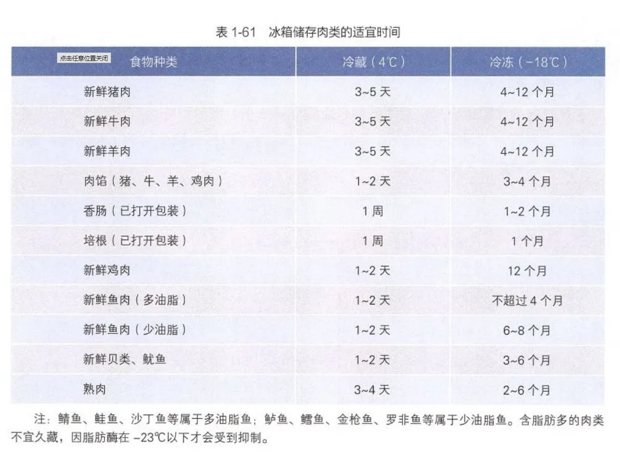 根据《中国居民膳食指南(2022)》,在保持-18℃的冷冻情况下,禽畜类冷冻肉的大致保质期为4~12个月,水产类冷冻肉的大致保质期为2~8个月。