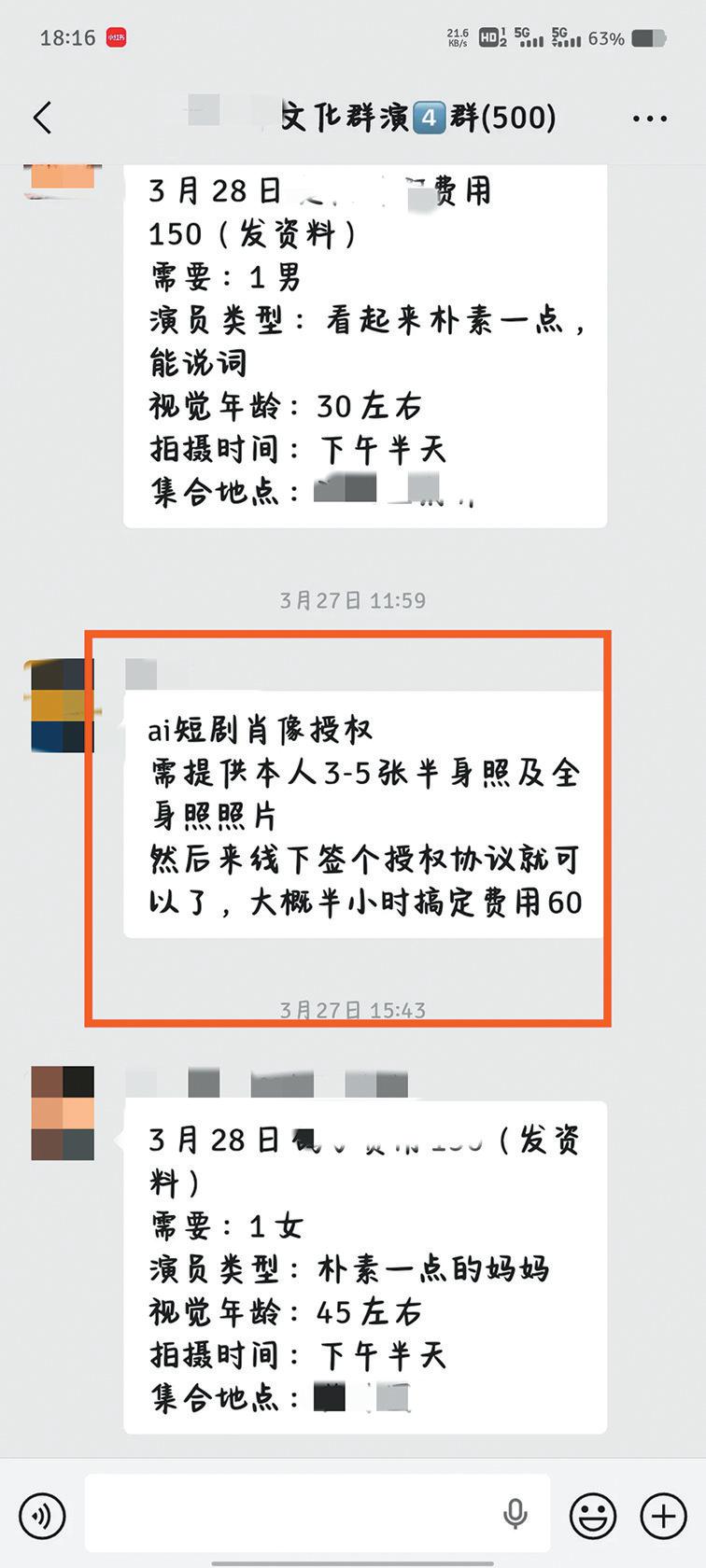 杨晨提到,目前已经有公司开始尝试签约演员肖像权,这可能是未来的一种方向。群演珂珂告诉新京报记者,群演群中已经出现60元购买“AI短剧肖像授权”,只需提供本人3张至5张半身照及全身照片,并线下签署授权协议,半小时就能完成。