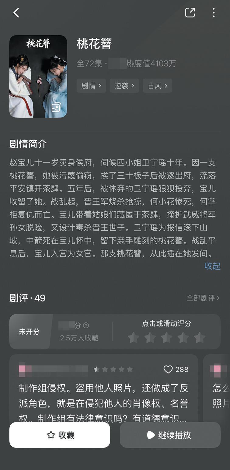 新京报记者看到,短剧《桃花簪》作者声明中显示“内容由AI生成”,标签为“剧情、逆袭、古风”,共72集,讲述了一个被诬陷赶出侯府的丫鬟,在战乱中辗转求生,最终入宫成为女官的故事。截至4月1日上午,站内热度值4103万,共有2.5万收藏。
