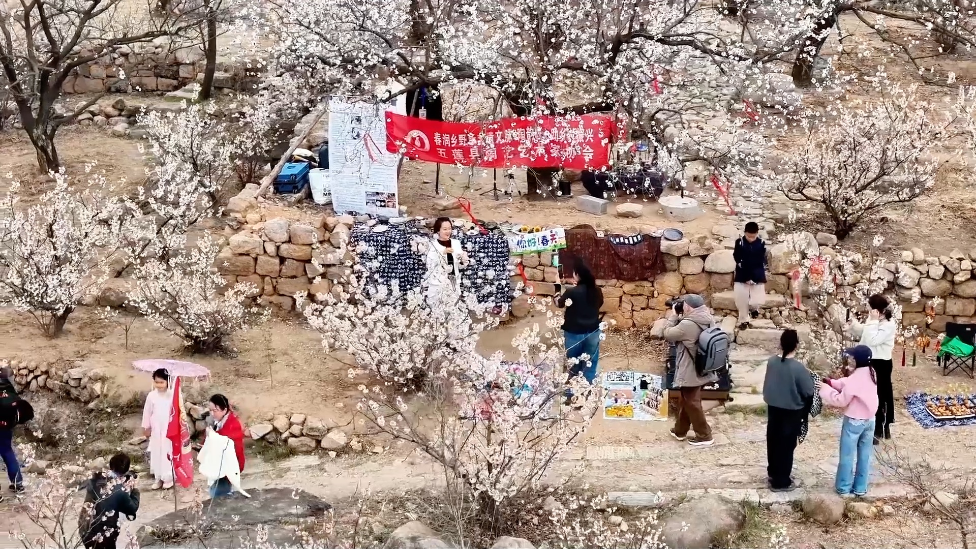 山东省日照市五莲县大旺村300余亩樱桃花竞相绽放。当地以花为媒,举办赏花活动,融合歌舞表演、非遗市集、农特产品销售等,打造一站式春日文旅场景。