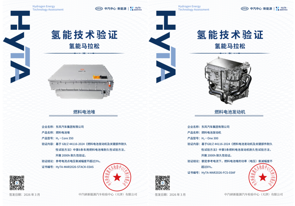 东风H₂・Core 350电堆、H₂・One 300系统荣获HyTA验证证书