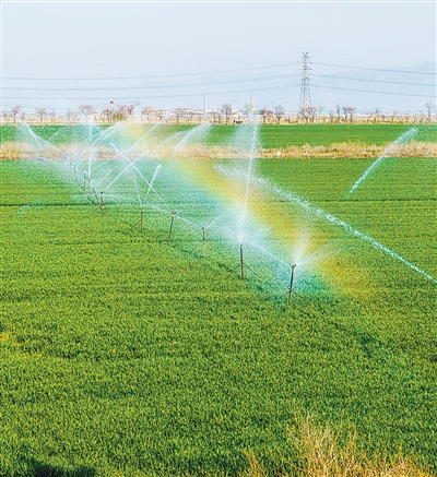 山西省永济市虞乡镇的农田里,现代化喷灌设备正在开展春灌作业。程永仁摄(影像中国)