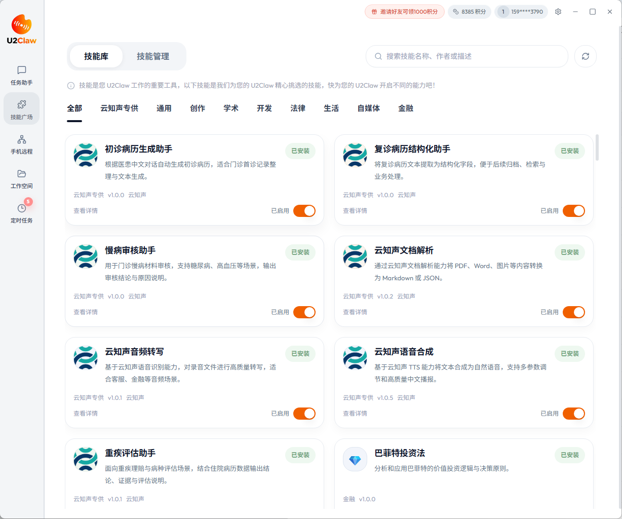 U2Claw深度集成云知声经过市场验证的AI原子能力,产品原生打通文档处理、语音识别(ASR)、语音合成(TTS)三大核心模块,同时无缝融合医疗垂直领域模型能力。这些核心能力均依托云知声已正式发布的成熟模型提供坚实支撑,并通过技能化封装技术,实现稳定、高效的调用体验,为各类场景应用筑牢基础。