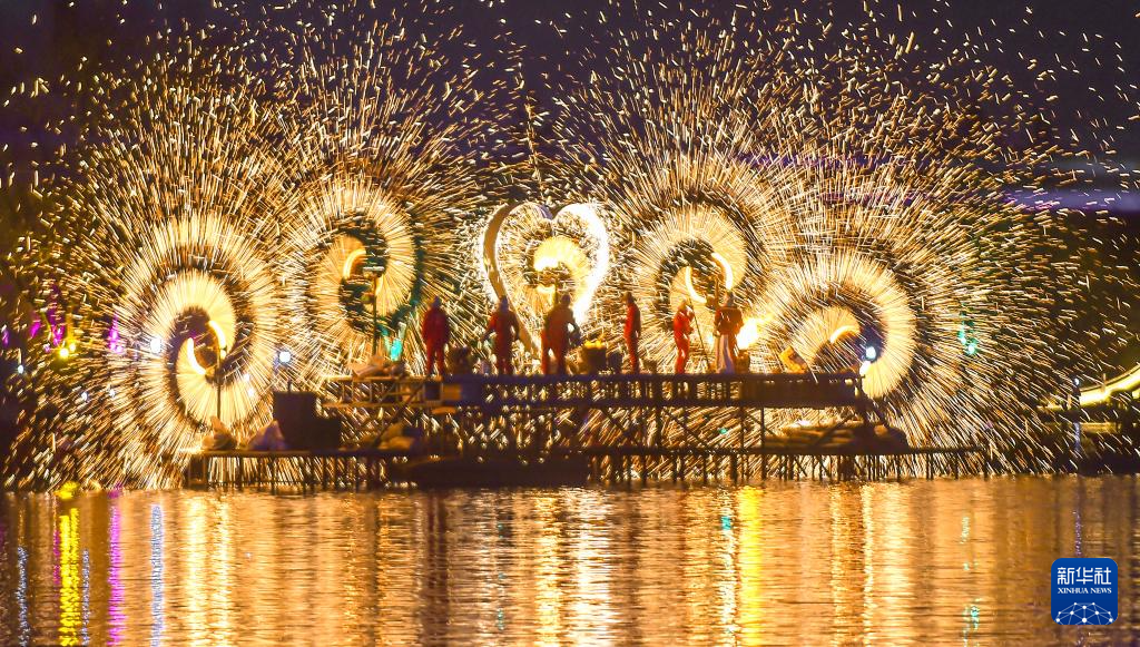 这是2026年2月17日在河南省洛阳市隋唐城遗址植物园“神都上元灯会”上拍摄的水上打铁花表演。新华社发(黄政伟 摄)