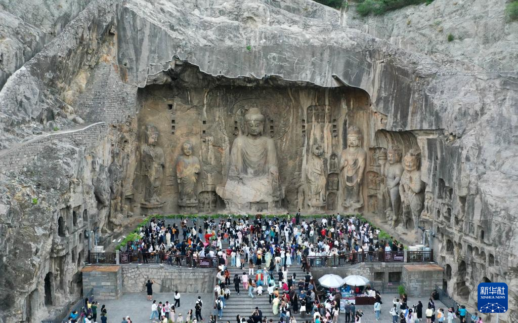 2025年4月24日,游客在河南省洛阳市龙门石窟景区游览(无人机照片)。新华社记者 李嘉南 摄