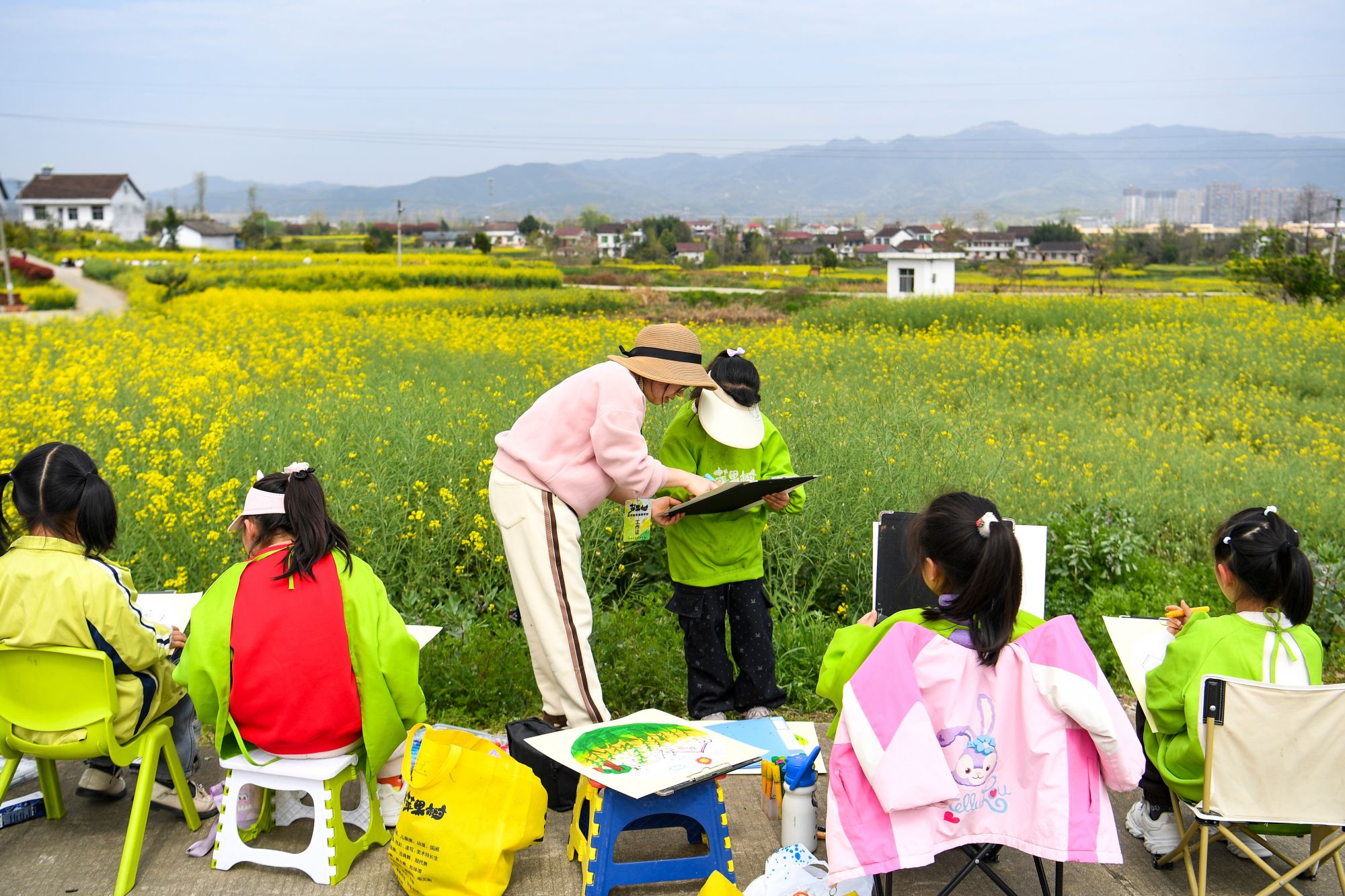 3月28日,学生在陕西省汉中市西乡县杨河镇高土坝社区油菜花观花点研学。新华社记者邹竞一 摄