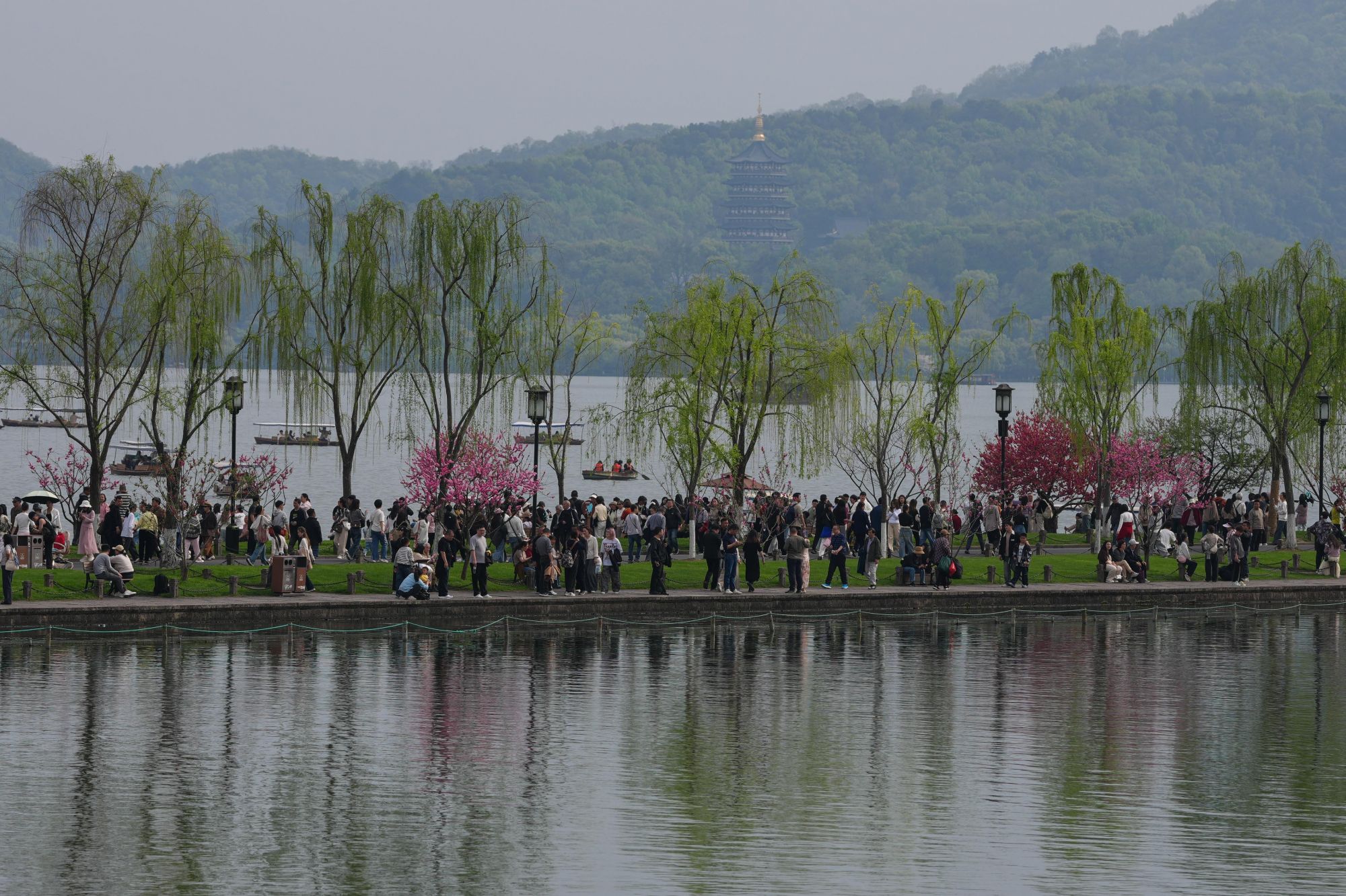 4月2日,浙江杭州西湖景区呈现出桃红柳绿的春日丽景,吸引大批市民和游客观赏。新华社记者黄宗治 摄