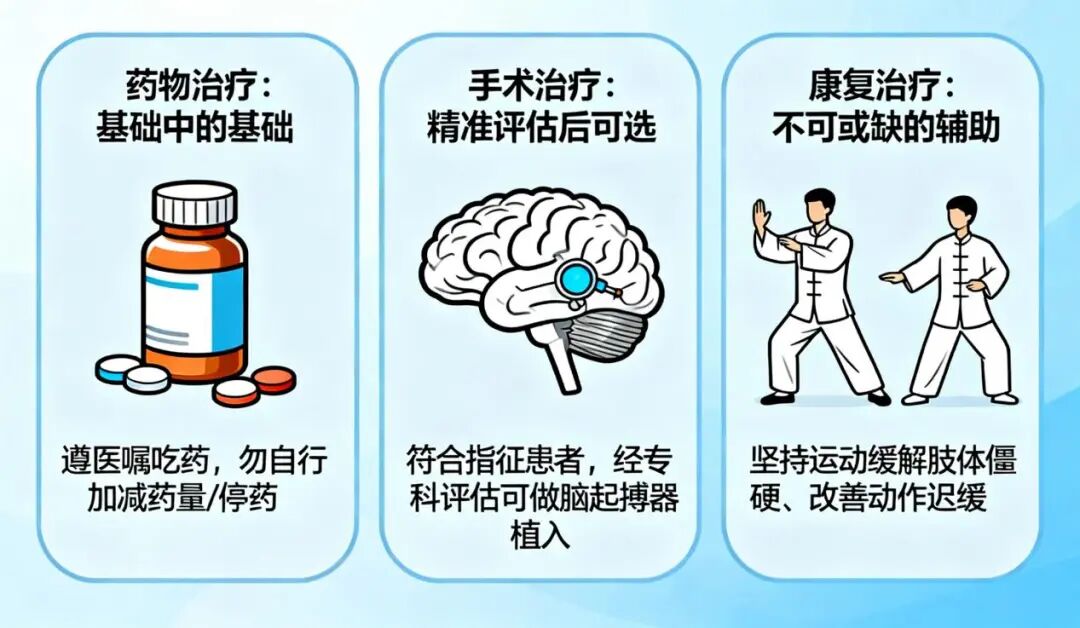 目前帕金森病虽然无法彻底根治,但只要早发现+科学规范治疗,完全能稳住症状、延缓病情发展,保住高质量生活!