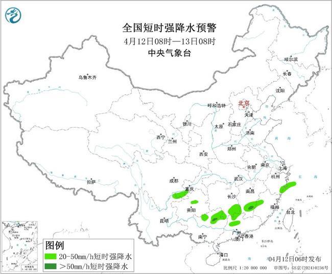 预计4月12日8时至13日8时,江南东部和南部、华南北部、西南地区东部等地的部分地区将有8级以上雷暴大风或冰雹天气,其中,广西北部、广东北部、江西南部等地局地将有10级以上雷暴大风,最大风力可达11级以上;江南东部和南部、华南北部等地的部分地区将有小时雨量大于20毫米的短时强降水天气,其中,江西南部、广西北部等地局地小时雨量大于50毫米。