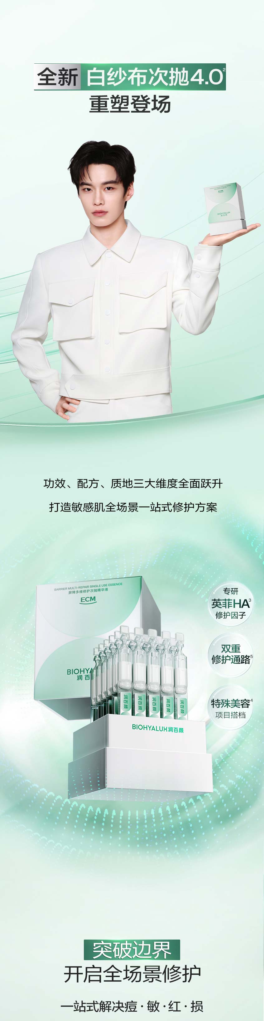 而华熙生物旗下润百颜把这个逻辑概全盘开启的护肤产业,它不是把你变成某种模板,而是让你成为你自己。事实上,润百颜做ECM,其实并不是最近才开始的,而是早有布局。润百颜这个品牌诞生于2012年,最初是华熙生物进军医美下游市场的开端。2012年,“润百颜®”注射用修饰透明质酸钠凝胶获得CFDA批准上市,成为首个国产交联透明质酸软组织填充剂。2014年,润百颜将眼药水生产的BFS无菌灌装技术引入护肤品领域,首创了“一次一支一抛”的次抛精华品类。可以说,从诞生之日起,润百颜就带着华熙生物二十多年透明质酸研发的科技基因。