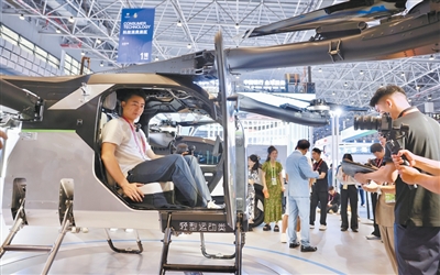 观众在第六届消博会科技消费展区体验分体式飞行汽车。本报记者 蒋雨师摄