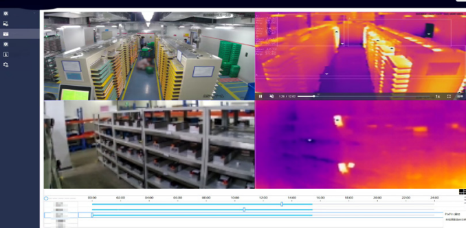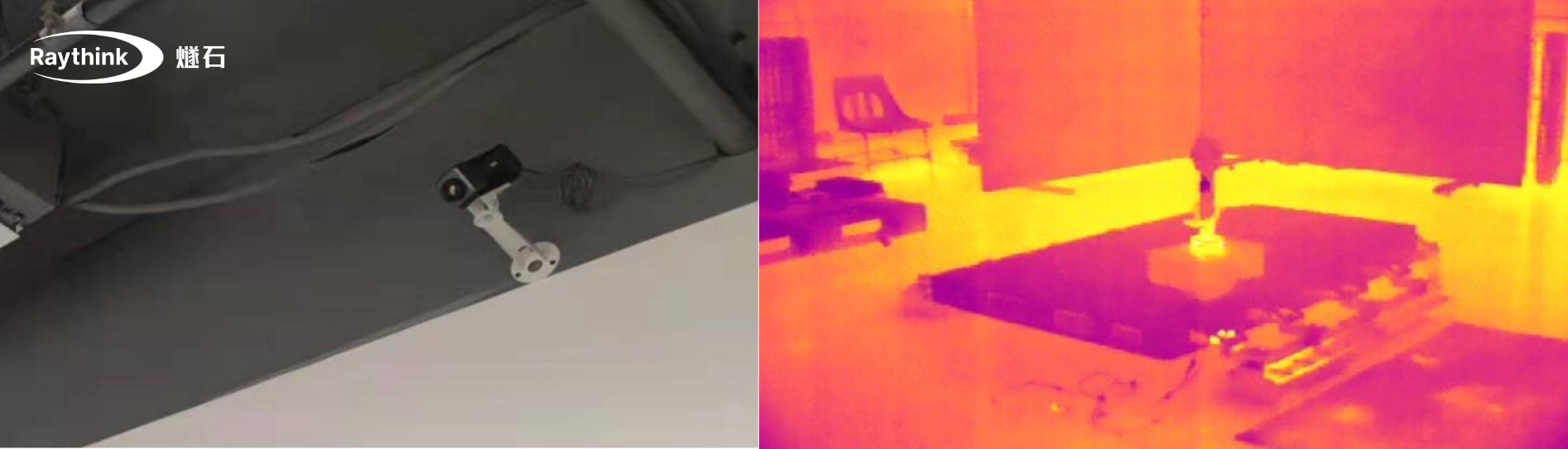 Raythink睿创燧石提供分层布控方案,除在关键位置部署在线测温热像仪外,在仓库墙壁或设施角落安装双光谱热成像可见光相机,对存储区域进行全景扫描,实现对货架、过道和开放区域的广域温度监控。
