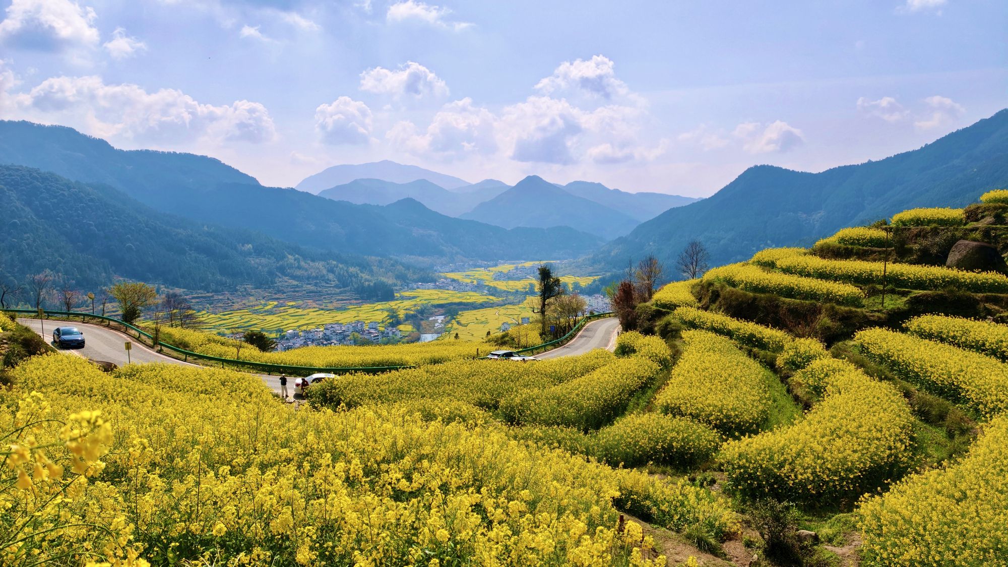 清晨的婺源江岭景区,晨雾刚刚散去,万亩梯田便在春光里铺展开来,金黄的油菜花顺着山势层层叠叠涌向山脚。