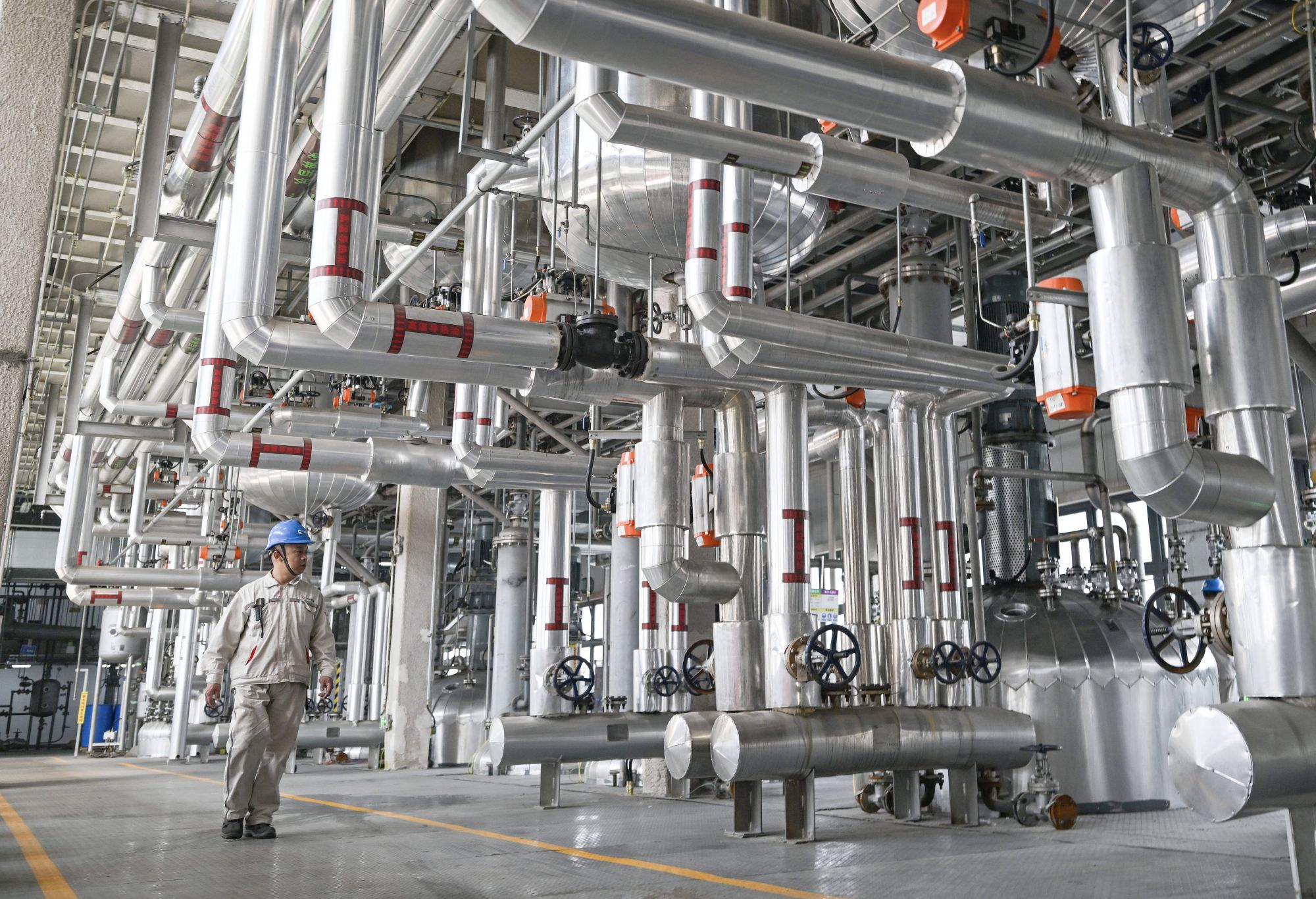 4月15日,在天津灯塔涂料工业发展有限公司树脂车间,工作人员查看自动化生产设备运转情况。新华社记者赵子硕 摄