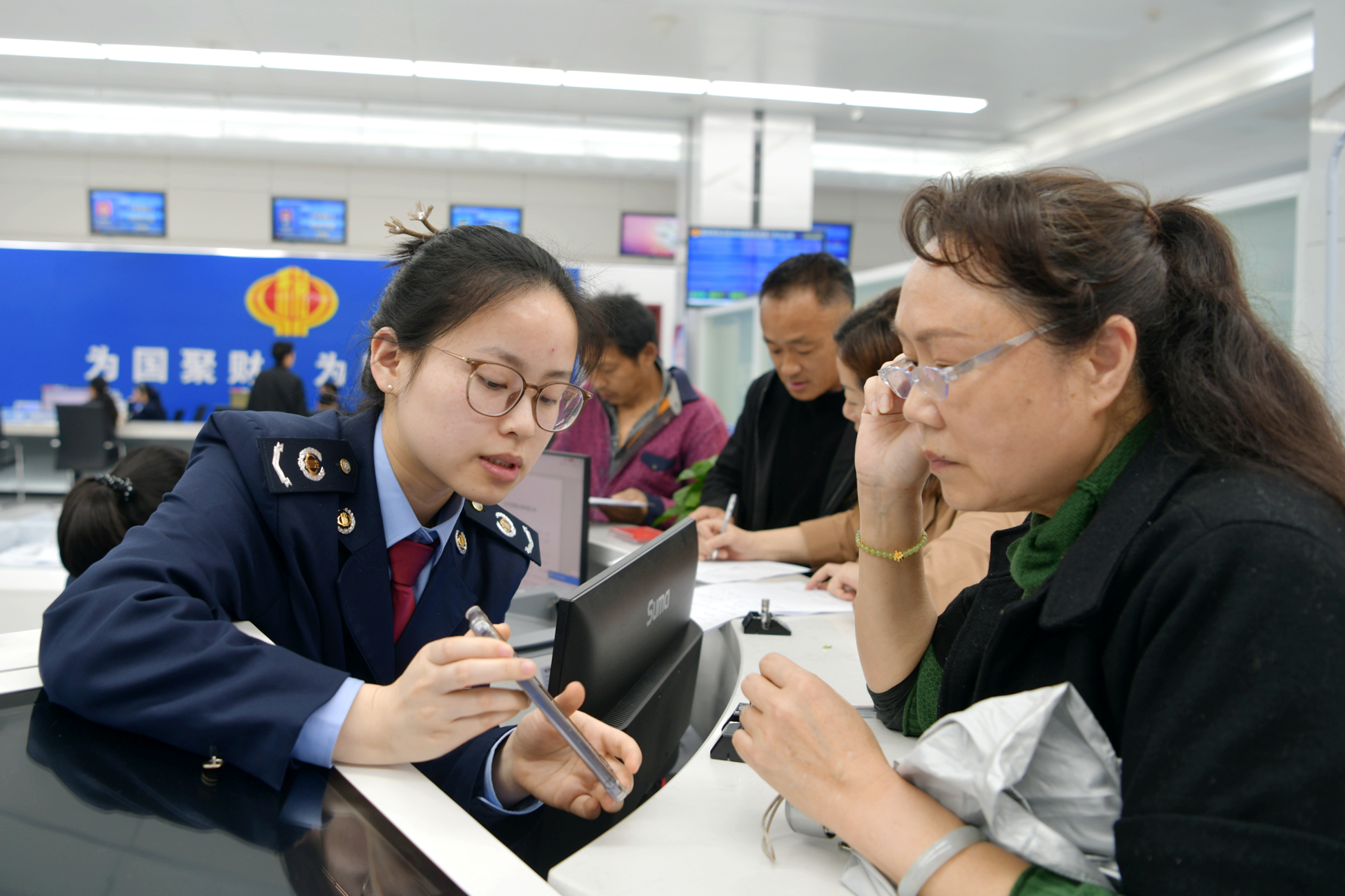 4月8日,在湖北省咸宁市通城县政务服务中心,工作人员指导市民手机办理纳税业务。新华社发(刘建平 摄)