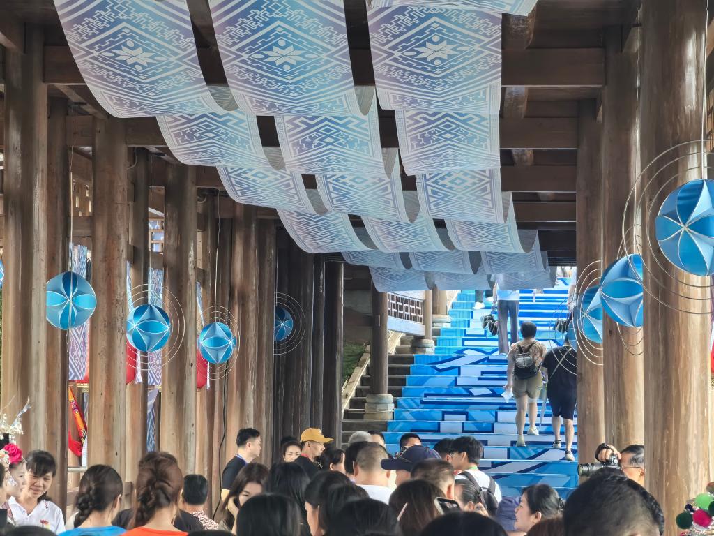 在这场民俗文化盛会上,山歌嘹亮、丝竹悦耳。当中的亮眼元素少不了承载着千年文脉的壮锦,无论是风雨桥上飞扬的飘带,还是青年身着的民族服饰,壮锦元素无处不在。