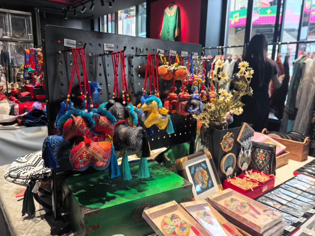 “广西三月三”活动期间,壮锦一跃成为文旅消费的亮眼主角。在南宁民歌湖,不少游客身着壮锦服饰拍照打卡,将岭南风光与锦绣纹样定格成美好瞬间;广西壮族自治区博物馆文创商店内,缀有八角纹、蝴蝶纹的壮锦“娃衣”备受青睐,小巧精致的玩偶身着传统纹样服饰,成为年轻人追捧的潮流单品。