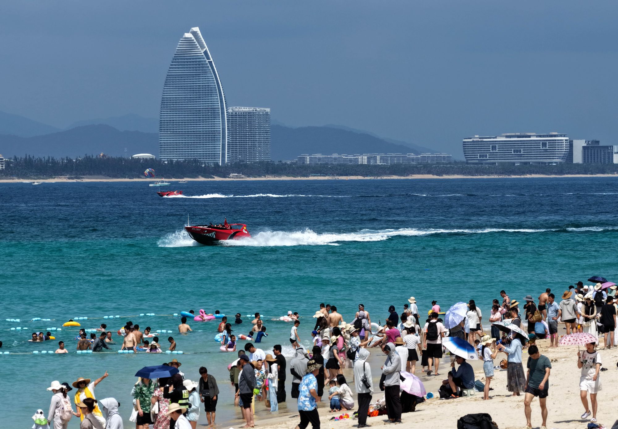 2月22日,游客在海南省三亚市蜈支洲岛踏浪戏水(无人机照片)。新华社记者 赵颖全 摄