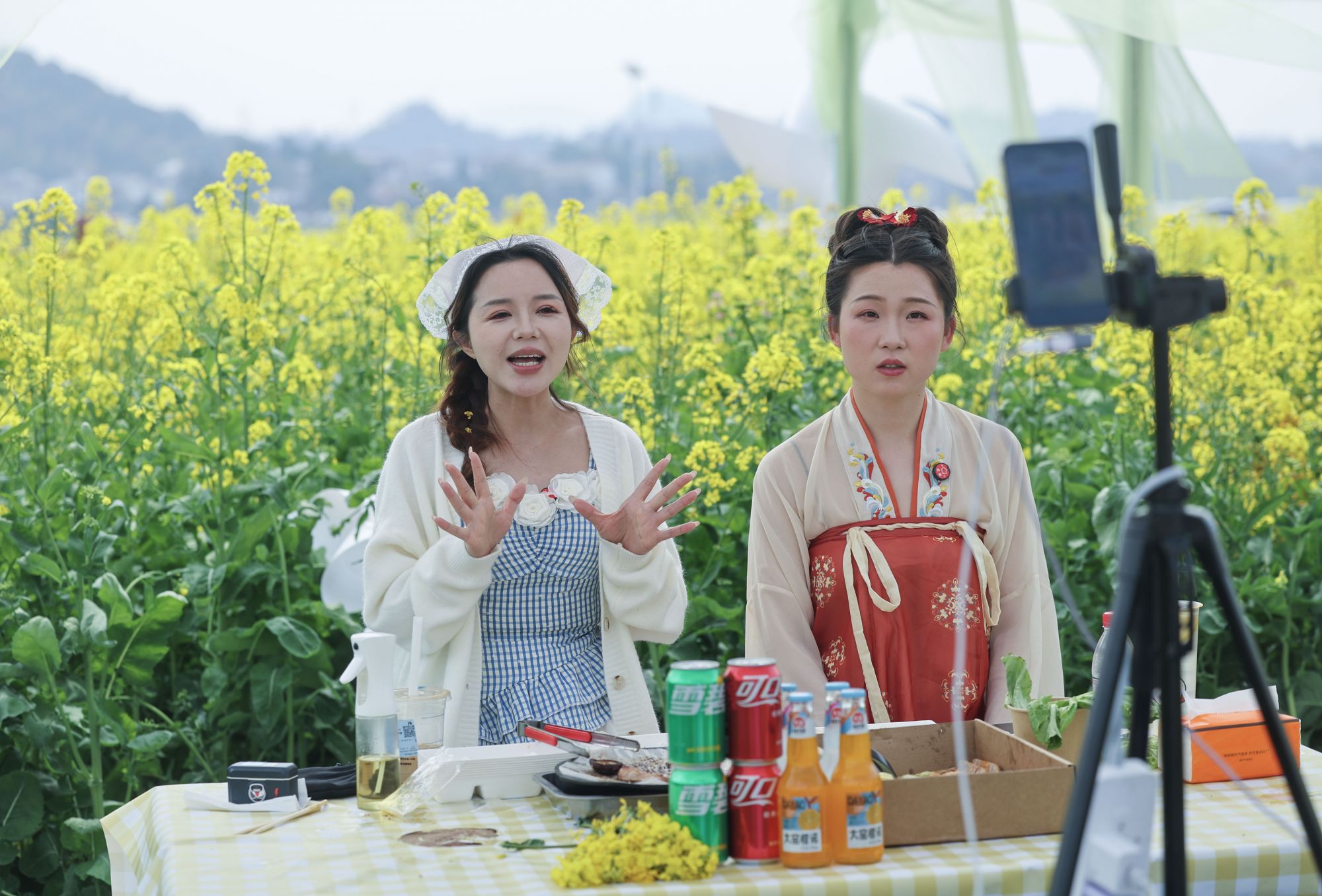 3月15日,主播在浙江省建德市更楼街道城南城市田园油菜花田里直播。新华社记者 徐昱 摄
