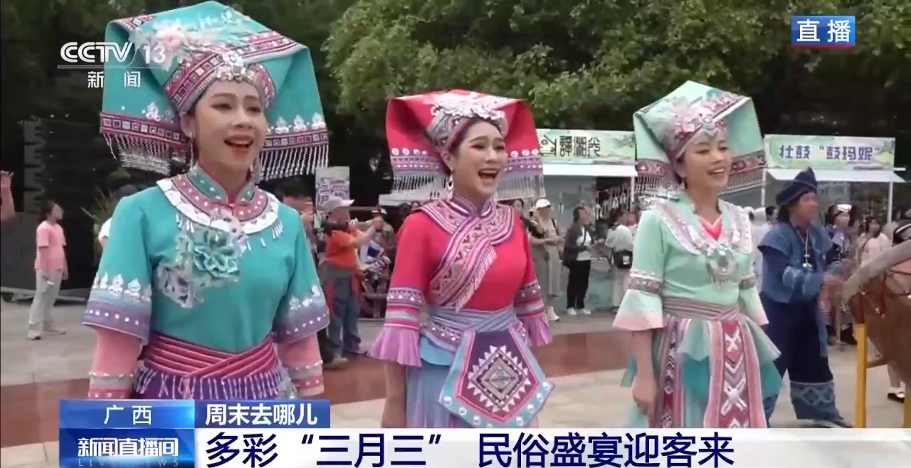 总台记者 邓君洋:农历三月三来临,广西南宁青秀山风景区的铜鼓广场正在举办民歌、民俗一条街活动。