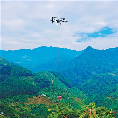 云南红河哈尼族彝族自治州河口瑶族自治县老范寨乡无人机正在运送芒果。老范寨乡老挝籍居民 李丽 摄