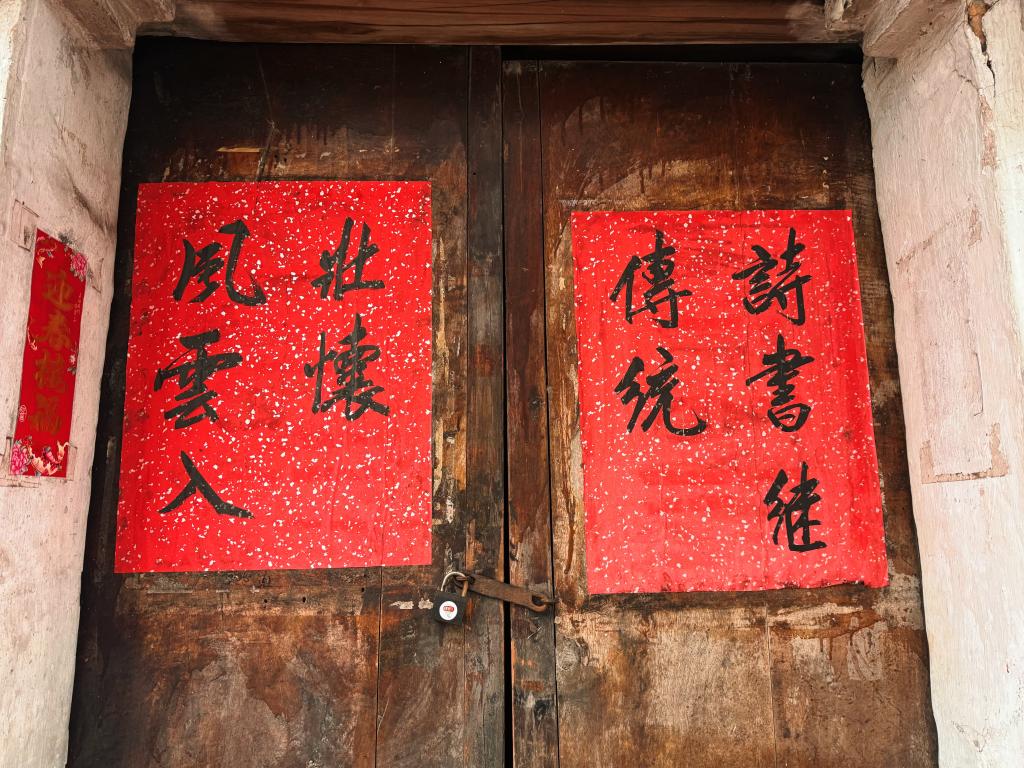 在新叶村老宅木门上,手书春联寄寓着崇文重教的家风与心怀天下的胸襟。新华社记者 郑可意 摄