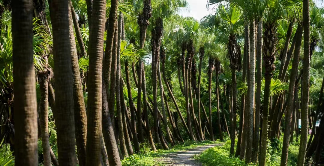 这座公园坐落于潭江水域冲积而成的天然岛屿上,占地约1500亩,涵盖了葵林、鱼塘、水田、柑围等多种生态区域,其中蒲葵林面积约800亩,是全国少有的、保存较完整且规模宏大的葵林生态系统。