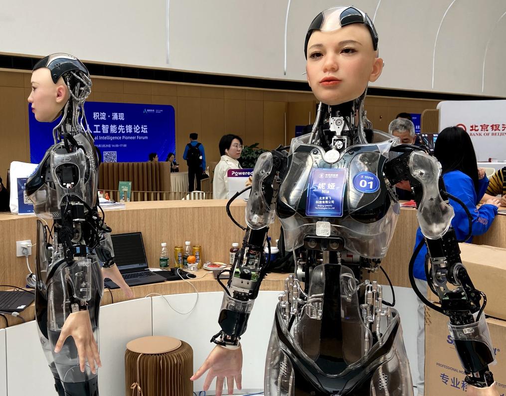 3月29日,在2025中关村论坛年会上,两位负责前台迎宾招待的人形机器人。新华社记者 魏梦佳 摄