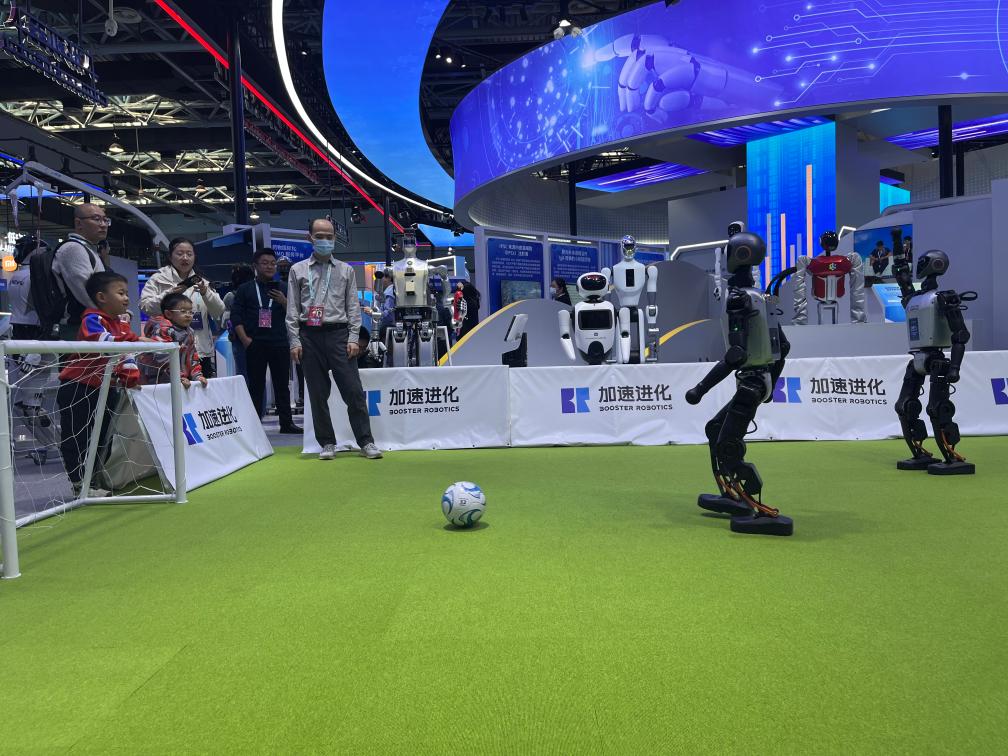 北京加速进化科技有限公司运营负责人宋安琪说:“这款踢足球的机器人拥有较强的运动能力,如果两个机器人发生碰撞,也能保持稳定,即使摔倒了也能实现一秒钟快速起身,这是基于强大的运动控制算法能力。目前已累计交付100多台机器人,主要应用于市场二次开发,下一阶段我们将开拓机器人搬运、巡检、配送等应用场景。”
