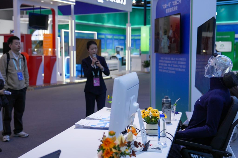 在中关村展示中心常设展内,参观者在听取“北脑一号”“北脑二号”智能脑机系统介绍。新华社记者 鞠焕宗 摄