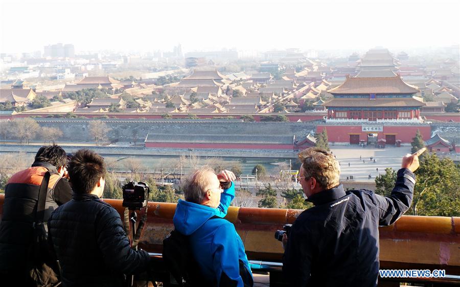 File photo taken on Feb. 8, 2017 shows tourists watching the Palace Museum at Jingshan Park in Beijing, capital of China. Beijing witnesses a great change in the past five years and the city will keep focusing on the coordinated development in Beijing, Tianjin and Hebei regions and objective of removing non-capital functions. (Xinhua/Li Xin)
