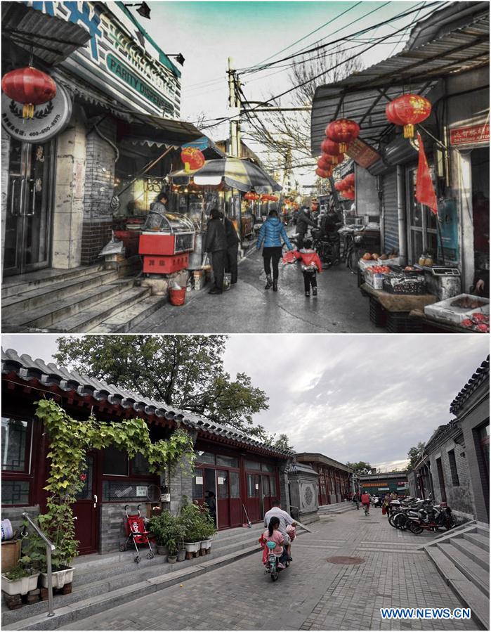 Combined file photo taken on Sept. 5, 2017 (lower) shows the Dazhiqiao Hutong in Beijing, capital of China. Beijing witnesses a great change in the past five years and the city will keep focusing on the coordinated development in Beijing, Tianjin and Hebei regions and objective of removing non-capital functions. (Xinhua)