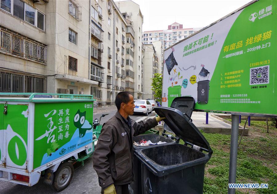 File photo taken on April 13, 2017 shows the classified trash bins in a residential community of Beijing, capital of China. Beijing witnesses a great change in the past five years and the city will keep focusing on the coordinated development in Beijing, Tianjin and Hebei regions and objective of removing non-capital functions. (Xinhua/Li Xin)