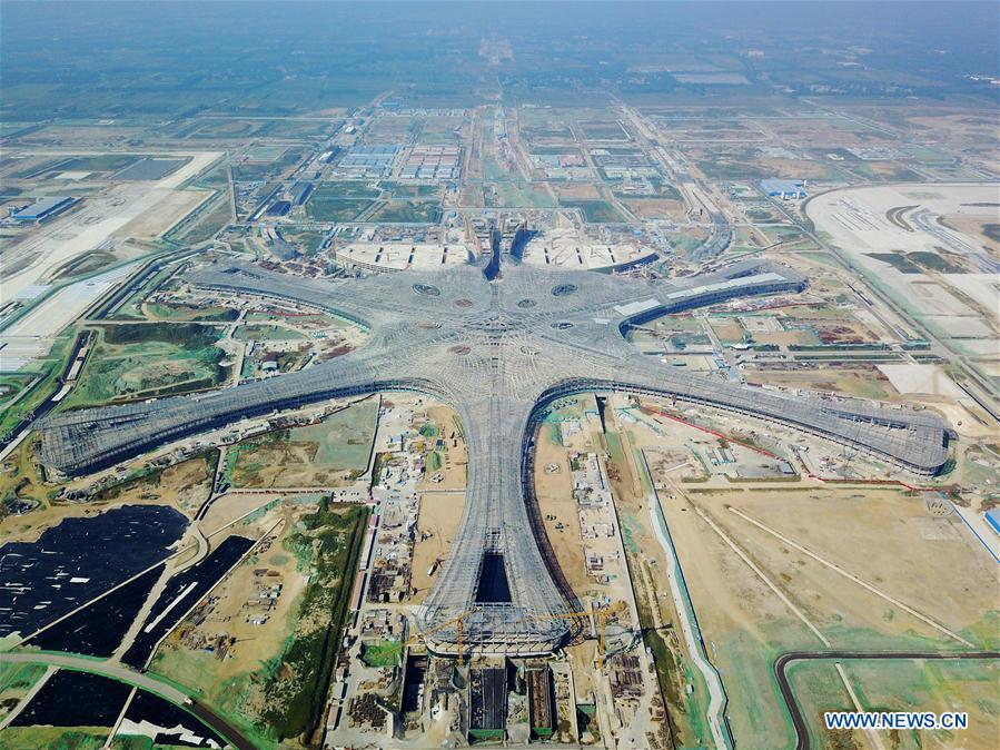 File photo taken on Sept. 18, 2017 shows the terminal of Beijing's new international airport under construction in Beijing, capital of China. Beijing witnesses a great change in the past five years and the city will keep focusing on the coordinated development in Beijing, Tianjin and Hebei regions and objective of removing non-capital functions. (Xinhua/Ju Huanzong)
