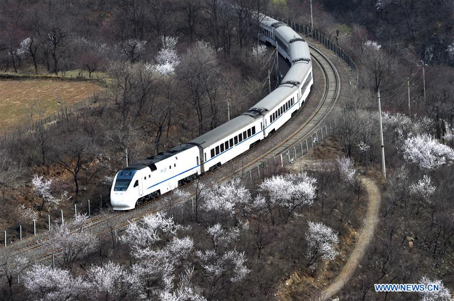 File photo taken on Feb. 28, 2017 shows a train running through a field of flowers near the Juyongguan Pass of the Great Wall in Beijing, capital of China. Beijing witnesses a great change in the past five years and the city will keep focusing on the coordinated development in Beijing, Tianjin and Hebei regions and objective of removing non-capital functions. (Xinhua/Ju Huanzong)