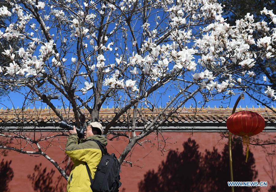 File photo taken on March 12, 2017 shows a tourist taking photos of magnolia flowers along the Changan Avenue in Beijing, capital of China. Beijing witnesses a great change in the past five years and the city will keep focusing on the coordinated development in Beijing, Tianjin and Hebei regions and objective of removing non-capital functions. (Xinhua/Luo Xiaoguang)