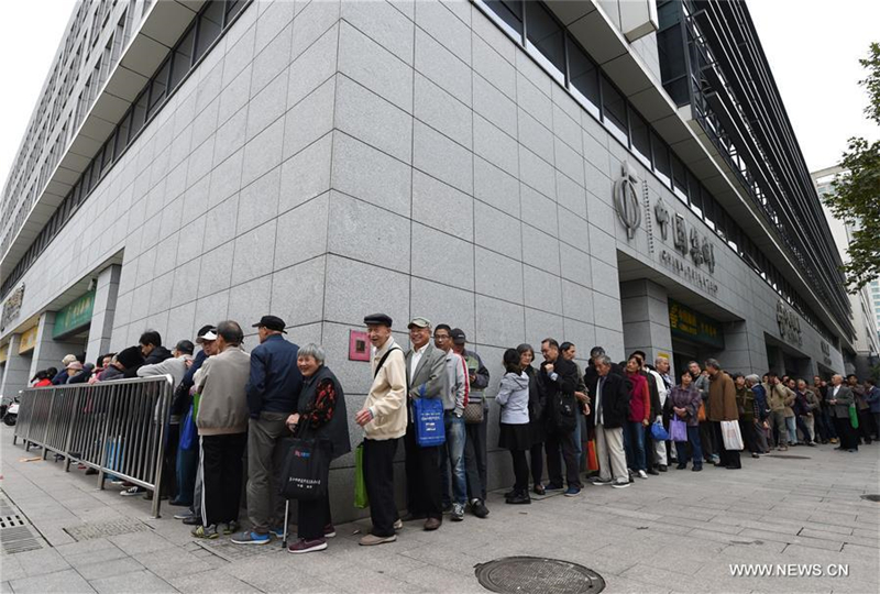 People line up to buy stamps outside of a philatelic shop in Nanjing, east China's Jiangsu Province, Oct. 18, 2017. China Post issued a set of commemorative stamps marking the 19th National Congress of the Communist Party of China on Wednesday. The set consists of two stamps and a stamp sheetlet. (Xinhua/Sun Can)