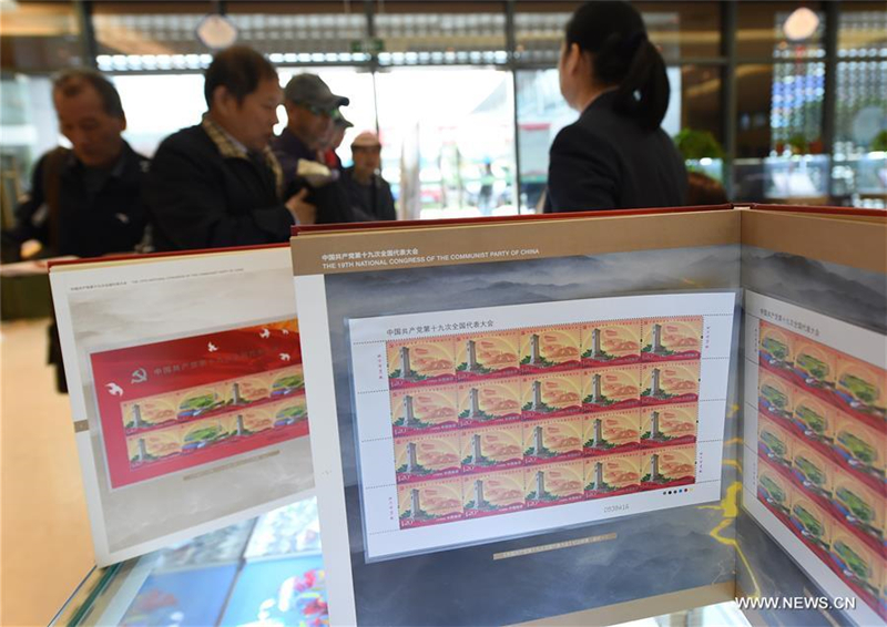 A postal staff member shows a stamp sheetlet in Hengshui, north China's Hebei Province, Oct. 18, 2017. China Post issued a set of commemorative stamps marking the 19th National Congress of the Communist Party of China on Wednesday. The set consists of two stamps and a stamp sheetlet. (Xinhua/Zhu Xudong)