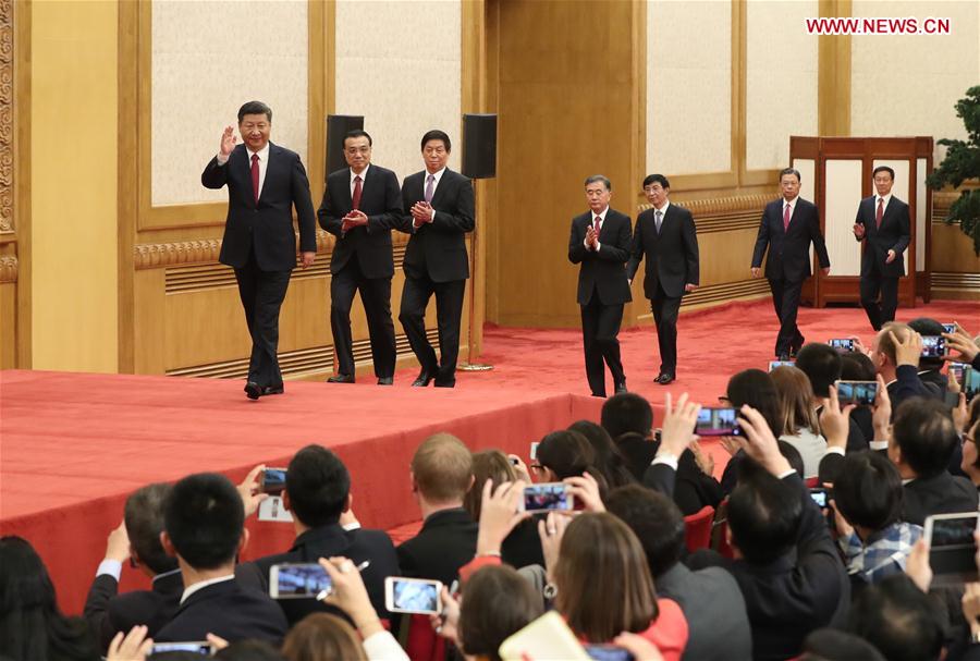 Xi Jinping(C), general secretary of the Central Committee of the Communist Party of China (CPC), and the other newly-elected members of the Standing Committee of the Political Bureau of the 19th CPC Central CommitteeLi Keqiang(3rd R), Li Zhanshu (3rd L), Wang Yang (2nd R), Wang Huning (2nd L), Zhao Leji (1st R) and Han Zheng, meet the press at the Great Hall of the People in Beijing, capital of China, Oct. 25, 2017. (Xinhua/Li Tao)