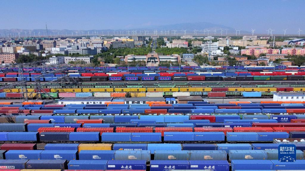 在新疆阿拉山口站宽准轨编组场,出入境中欧班列集结等待出发(2022年9月10日摄,无人机照片)。新华社发(陈乾 摄)