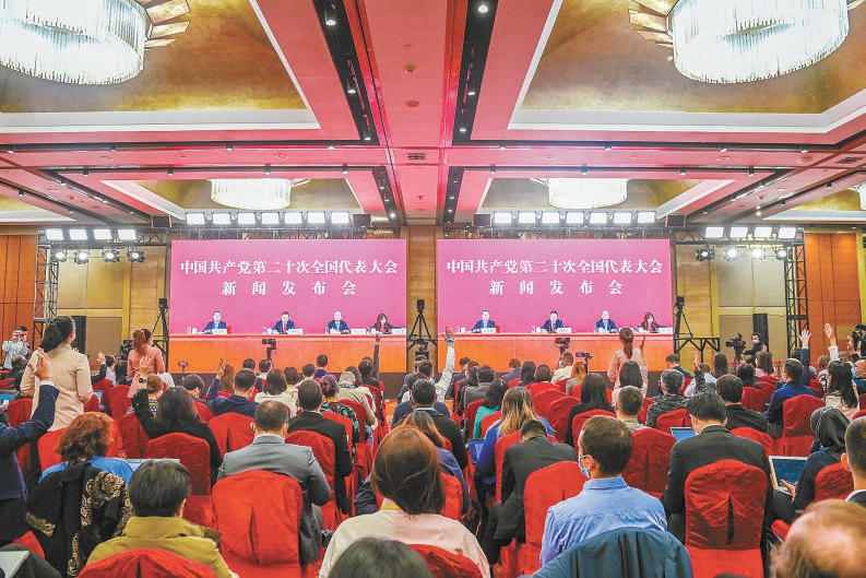 15日,中国共产党第二十次全国代表大会新闻发言人孙业礼在北京人民大会堂举行新闻发布会。图为媒体记者在位于北京新世纪日航饭店的分会场参加发布会。 本报记者 武亦彬摄