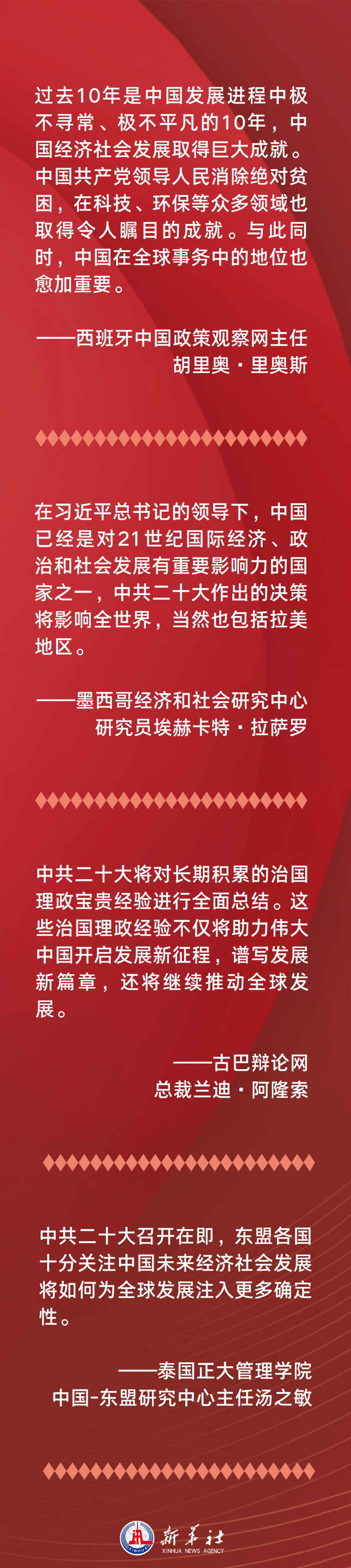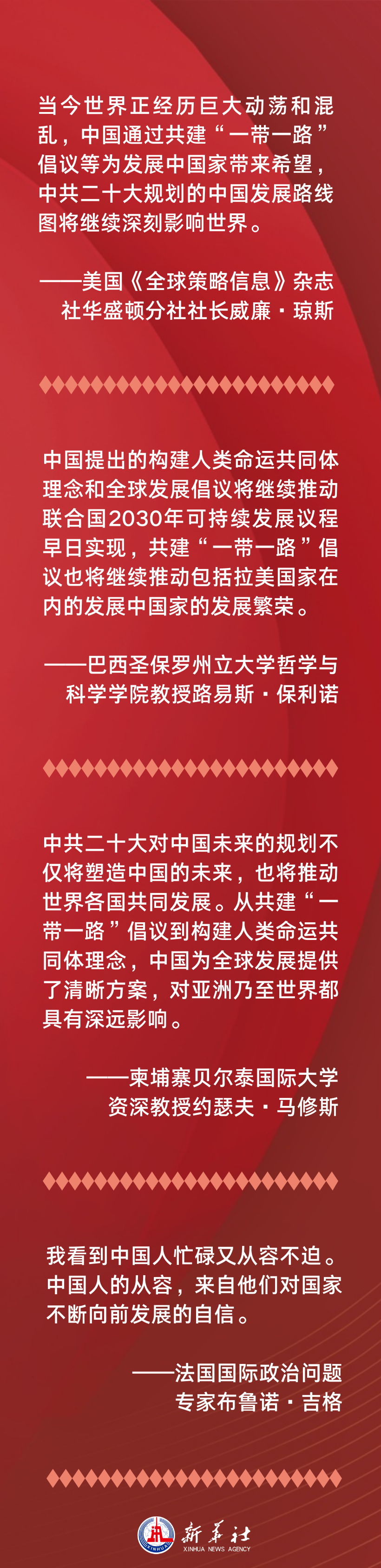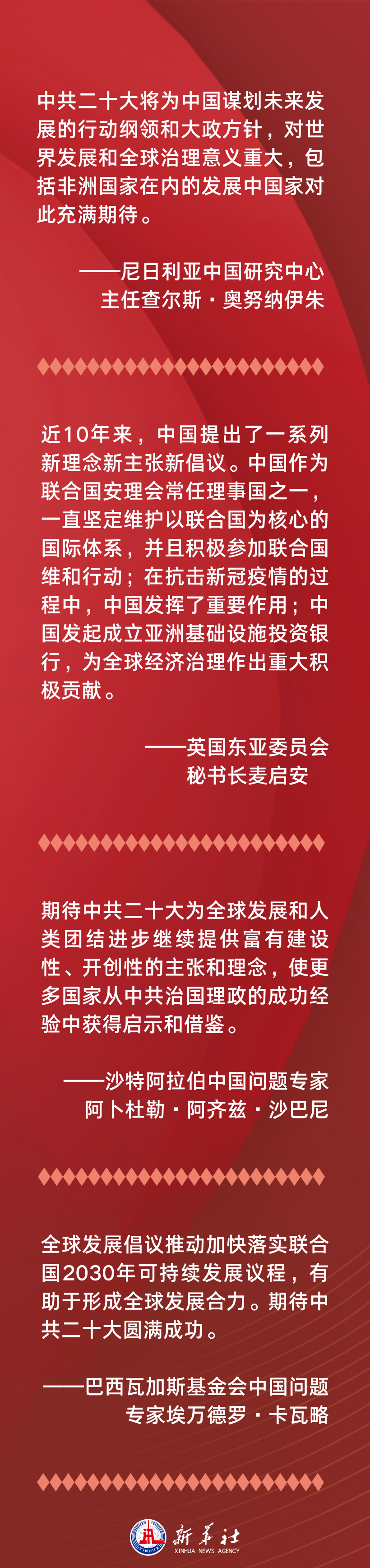 国际社会高度关注中共二十大将为中国未来发展制定出的路线图,以及中国新发展为世界和平与发展和人类文明进步提供的新启迪、新动力。