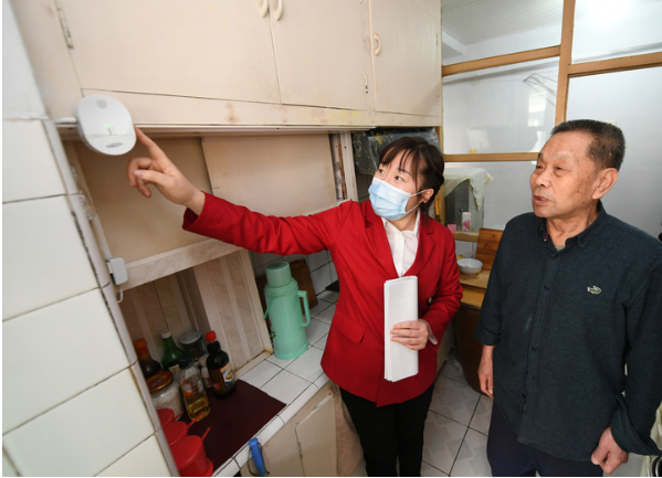 吉林省长春市长山花园社区党委书记韩丽萍(左)到独居老人家中检查燃气报警设备(资料照片)。新华社发