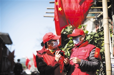 10月16日,西城区东新帘子胡同,志愿者收听开幕会直播。新京报记者 王嘉宁 摄