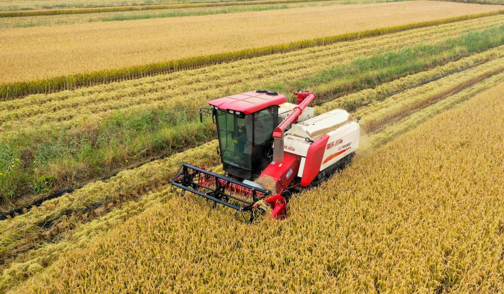 在天津市津南区小站镇坨子地村,水稻收割机在田间作业。新华社记者 孙凡越 摄
