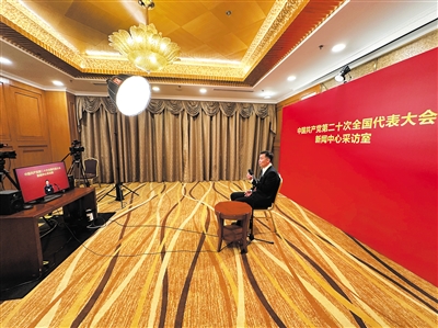 10月17日,中国共产党第二十次全国代表大会新闻中心,新京报记者连线党的二十大代表、甘肃省酒泉市公安局肃州分局社区民警康丽。新京报记者 蒋鹏峰 摄